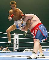 "The Beast" threw some nice low kicks, and when a fatigued Akebono relaxed his guard, got a solid left punch through that stunned the Sumo wrestler. It was a right hook that sent Akebono to the canvas for the first down. But to his credit, Akebono struggled to his feet to beat the count.