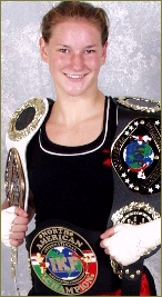 Meehan's opponent, Sher Noah claimed to be 16-0 as an amateur boxer and 1-3 as a pro boxer, but none of that experience did much to help her. In the second round, Sher turned her back to Meehan and when she turned back around, Meehan landed a great attack of punch and kicks to her stomach and at 1:10 of the round the bout was over. As in many previous Boxer vs Kickboxer match-ups, the outcome was the same, kickboxer win, Boxer lose as Sher just could not stand toe to toe with the experienced Meehan. The bout was fought under Pro International rules however Sher insisted upon wearing shinpads, a big NO in Pro Kickboxing. However somehow, those in charge allowed Sher to wear them. Needless to say, it didn't help her. Sher looked anything but an experienced boxer as Meehan took her apart with her hand combinations. Sher was able to land one good shot to Meehan's jaw but that was about it. Meehan won the 2001 IKF USA National Amateur Tournament IR Flyweight title when she defeated Tracy Kuschel of Omaha, Nebraska by unanimous decision, 29-28, 30-28 & 30-28. At the 2002 IKF National Amateur Tournament she successfully defended her 2001 IR Title by defeating Tamie Lankey of Alexandria, Virginia by unanimous decision 29-27, 29-27 & 30-26. In 2003 no women challenged Meehan for her National title so she switched rule styles and entered the Muay Thai Rules Bantamweight division. However she became the only walkover winner of the 2003 National Amateur Tournament when both her opponents, Alison Moore (2002 IR Champion) of New York, New York, USA and Alona Kipp of Casper, Wyoming, USA were both no shows at the event. Although not confirmed, it was possible Williams did not show because of the massive power outage in the north/east USA and parts of Canada that shut down many airports (Including New York) on Thursday before the event that year. We look forward to Princess Meehan's next big fight! |