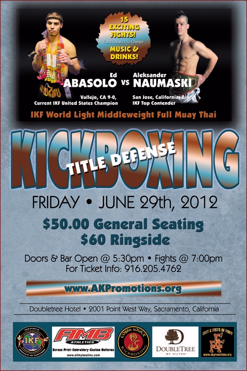 June 29th, 2012 marked Johnny Davis' (Right) - AK Promotions' "37th" Amateur Kickboxing event... "37". However, it's the last 17-18 events he will be most remembered for! As with the previous 17 events, this one was no less filled with lights, cameras and plenty of exciting Muay Thai Kickboxing ACTION! A good size crowd saw 11 exciting bouts at the Doubletree Hotel Ballroom in Sacramento. Three of which were IKF title bouts. One of course was the one many had been wanting to see since the end of the 2011 IKF West Coast Classic (WCC). A Rematch of the WCC Championship bout between WCC Champion and current IKF World Champion Ed Abasolo and challenger Aleksandar Naumoski as the Main event of the night for Abasolo's first defense of his IKF Light Middleweight World Title. Abasolo won the title on January 15th, 2012 in Sacramento, California, USA when he defeated Damien Earl of Phoenix, Arizona, USA, (12-2/5) by TKO at 1:04 of round 5.