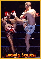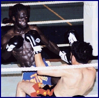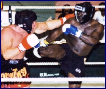 November 30th, 2002 Monterey, Calif. Riot at the Hyatt: This last year former IKF USA National Amateur MuayThai Super Heavyweight Champion, (2001) Carter Williams (Pictured in red, white and blue trunks) moved to the pro ranks of Kickboxing. Since there, he's only had 1 loss. A questionable 2 knockdown decision rule at a K-1 qualifier in Milwaukee, Wisconsin. Williams, like many kickboxers found it hard getting fights so he and his trainer Gene Fields of Modesto, CA decided to start doing some Pro Boxing as well, and with it, he's found more success. This last weekend, Williams won his second PRO boxing fight. He dominated opponent James Monroe (Being punched by Williams in both pictures) of Los Angeles over 4 rounds to earn a unanimous decision at the Hyatt Regency Hotel in Monterey, CA, USA. A sell out crowd of over 1,500 people saw the 22 year old fighter earn his second professional victory. Many know that Williams is a very accomplished kickboxer but have commented, making the transition to boxing would be difficult. With Monroe possessing much more amateur and professional boxing experience, this was a big test for Williams who proved once again, don't underestimate him for a minute! Williams stated "If it wasn't for my