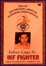 To see who else droppeddropped out and their reasons, just scroll to the bottom of each of the division pages. You can find the 3 divisions by clicking HERE. Finally each and every year there are fighters that drop out of this USA Championship event because they look on the fighters sheets and realize the person their matched up against appear to have won far too many times for them. Sometimes they try to switch to a different division but they keep forgetting, "This is a NATIONAL CHAMPIONSHIP Tournament... The contenders are "SUPPOSE" to be great. However, some have yet to experience greatness, but may do so at this event. Some of these fighters have never fought before but at least they have the guts to "Walk The Walk" against their peers in the sport. Speaking of fighters with no record, there were several who dared to "Walk The Walk" and took home the title in 2001 that never had fought before. They included;