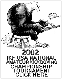 It's always Great to hear GREAT NEWS and we have some for all you Trainers and Fighters going to this years 2002 IKF USA NATIONAL FINALS! To begin with, Fighters, you will not be required to pay ANY TICKET FEES for ANY of the 3 sessions of fights (Saturday, Sunday and Sunday Night). You will be given a FREE Ticket for the Sunday Night Event and as always, will be allowed to attend the Sunday Finals event even if your not in the finals. This news is a great relief to the IKF as well who had previously been told that they would need to pay a Comp Ticket Fee if they let anyone in for free for the Sunday night event. The comp fee was $10. (Which is what the IKF was asking all fighters not in the Sunday night final event to pay) Obviously the IKF couldn't pay for everyone so they had to charge those attending. However, that has just been changed. "We didn't want any fighters to pay for anything more once there except for their own personal expenses." Said IKF President Steve Fossum. "These fighters pay enough as it is to simply GET to the Finals, let alone be expected to shell out more dollars just to see another event." But there's more Great news! As far as Trainers go, the IKF is please to announce Great News for them as well. This was going to be the first time the IKF was going to charge for a Trainers Laminated Photo ID Badge. The Laminated Photo ID Badge was going to be $20. There was several reasons for this;