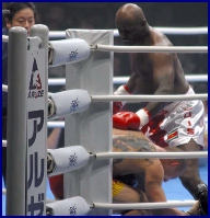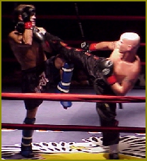 At 6' 7" tall and 374 lbs, very few thought he could be stopped but this last weekend, Bob Sapp, (Pictured at right & below) the big hype for K-1 was stopped BIG! At the K-1 show in Omiya at Saitama Super Arena, Mirko "Cro Cop" Filipovic (Left, 6'2, 227lbs) had little trouble in defeating Sapp in the 1st round in 1 minute, 26 seconds by KO from a straight left punch. Once Sapp hit the mat, he couldn't move and the 10-count was given for the KO win to Filipovic, as Mirko jumped up and down in the ring from excitement. Sapp was taken to the hospital in Saitama right after and it's confirmed that he did in fact suffer a broken eye socket. He bled under the crushed eye socket and in fact started tearing up. The Japanese media billed Mirko's win over Sapp as if a normal human being had defeated Godzilla. Excuses were made in the papers that Sapp had no time to train because he was spending 15 hours a day for publicity work. K-1 matchmaker Sadaharu Tanigawa said that he has all intentions of booking a re-match between Filipovic and Sapp. Sapp is out for at least six weeks after suffering a fractured right eye socket and a lacerated eyelid and is not expected to fight this coming May 2nd in Las Vegas, Nevada. Especially since the KO is well inside the International Rule of a 45 day KO/TKO suspension, something the K-1 organization is sure not to ignore. He has cancelled all future publicity events in Tokyo for the near future and was not at K-1's press conference on Monday. He made his first public appearance in Tokyo since getting KO'd (Right) wearing a pirate patch over his eye and said that he would be willing to confront Mirko in a PRIDE ring, saying "With that policeman guy, I'll fight him again and finish him." He said that Mirko got lucky with his straight left punch and that the punch was a one-in-10,000 shot of KOing him. For more on the story see the K-1 USA page by clicking HERE. That 45 day KO/TKO Suspension rule looks like it will cause even more damage at K-1 USA this coming May. As of 3-24-03 the tournament consisted of; Sapp, Michael McDonald, Rick Roufus, Dewey Cooper, Giuseppe DeNatale, Chad Bannon, Jefferson Silvia and Carter Williams. However, at the same event Sapp got KO'ed on, Ernesto Hoost KO'ed Silva (See Right) at 2:55 of round 1 so he's out of the line-up now too. Worse yet, the word on the street is that Chad Bannon (Venice, California, USA) will be fighting this weekend. Lets hope he doesn't meet the same fate as Sapp and Silva... Bannon has been an actor and stuntman on the show Battle Dome. Our question is, "Why would these fighters take such a risk fighting so close to another high profile event?" Oh well, looks like they will learn their lesson now... |
