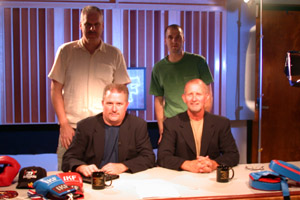 This week the IKF has been busy with shooting several segments of the first two IKF /CSS Kickboxing TV Program On Monday, IKF Champions Dave Marinoble, Carter Williams and Robert Elledge were all filmed and interviewed by Johnny Davis for 3 different segments of "Corner Talk". IKF World Ambassador Brooks Mason (In the picture sitting on right) was flown to the IKF Headquarters in California late Monday night and Mason and IKF President Steve Fossum (In the picture sitting on left) worked on show scripting all day Tuesday. Yesterday, Mason and Fossum spent the entire day at the programs post production facility (See Left at Fresh Air Media with Producer/Director/Editor Dale Kasperson and Production Assistant Eric Maddox) filming the sit-down desk segments (See Right) for the first two shows. The crew will be very busy at the upcoming IKF/TKO USA National Amateur Tournament getting a lot more interviews with fighters, trainers and other associates of the IKF and not to mention, filming more IKF Kickboxing Action! The Nationals Filming is being coordinated by Tim Bachman of Remote Control Productions out of south Carolina. For more info on the program Click HERE. |
