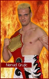 an explosive knee attack to drop his opponent, Nenad Grujic of