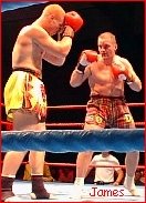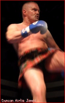 Across the ring from DeNatale will be the pride of Scotland, Duncan Airlie James. James' last fought for the IKF back in St. Helens, England on August 16th, 1998. There he faced Chris Wright of Merseyside, England for the vacant IKF Pro MTR Cruiserweight World Title. In the bout, James lost by a head kick KO at 2:04 of round 2 (At Right, after bout). Wright has not fought for some time and recent word is that he has retired from the ring. Unlike Wright, James has been VERY Busy in the ring and has no plans