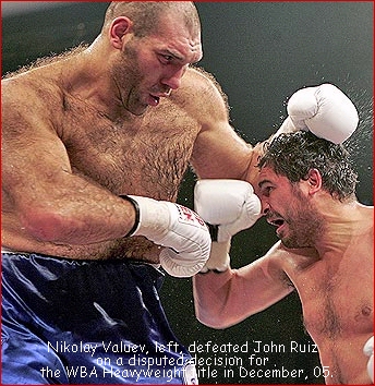 In any boxing club, sweat is part of the ambience, but in Russia, the sweat factor usually scores a one-two punch to the nose right from the doorway, reminding all who enter of what it smells like to be a nastoyashi muzhik, a real Russian man. On the wall of a small neighborhood boxing club in northwest Moscow, there is a huge, grainy photo of Stanislav Stepashkin, the 1964 Olympic featherweight champion who was one of Russia's early claims to international boxing fame, and a real Russian man if there ever was one. Stepashkin agreed two years ago to serve as president of the club, and the neighborhood boys here renamed it in his honor. These days, another photo hangs on the dank walls next to Stepashkin's, and while the picture isn't bigger, the man assuredly is: Nikolay Valuev, (43-0 with 31 wins by KO!) crowned in December as Russia's first World Boxing Assn. Heavyweight Champion. Valuev himself strode into the gym recently during his triumphant return to Russia after the title bout, in which he defeated American John Ruiz on a controversial decision in Berlin to become the tallest (7 feet) and heaviest (323 pounds) World Champion in history. He's so big he usually steps into the ring over the top rope so big that the adolescent pugilists at the Stepashkin Club would have barely been able to land a hook as high as his belly, if they had the nerve to try. Most just craned their necks and gawked, or melted into nervous grins. "I don't know about the world, but here in Russia, he's been very famous for a long time. For the kids here, this is such an emotional thing," said Alexei Barsukov, a former trainer who came back for the spread of iced tortes, fresh fruit and champagne laid out in the manager's office in Valuev's honor. In the rest of the world, Valuev, 32, is known as the "Beast from the East" (promoter Don King wants to call him "King Kong" when he defends his title in the U.S.), but in his homeland, he is more often known as the "Russian Giant." His brain is played up here as much as his brawn, a boxer who reads Tolstoy and writes poetry to his wife? - along with his diffident, quiet demeanor. "You can't impose your own manner of fighting on him, and that's because of his life position. He's very calm, and very, very controlled," Barsukov said. Added Vladimir Grachev, boxing coach at the club: "You have a person born with such a physique once in a hundred years. Such a build, and such an intellect Russia may not get another such man in our lifetimes." American Ruiz thought he had the fight won with his tactics of grabbing and jabbing a man 85 pounds heavier than his 238 pounds. He slipped in a few punches and tied up Valuev. But the judges' decision changed everything. While one judge scored the fight even at 114-114, the other two gave Valuev the edge at 116-113 and 116-114. Though the crowd booed, Valuev was thrilled at the judgment. "I had to wait 12 years for this and now it has happened," the 32-year-old Valuev said. "It's fantastic." Valuev only did real damage with one punch, in the final round no less, but it appeared to be enough. He caught Ruiz on the chin with a straight left that wobbled the champ. Ruiz clinched his way to the end of the fight. Valuev began landing jabs in the first round and started throwing combinations in the seventh. In the ninth, he even danced a bit. The big Russian improved to 43-0 with one no decision, while Ruiz's record dropped to 42-6-1. "Boxing is the only sport where you can get robbed without a gun," Ruiz said. "My promoter Don King should do his job and get a rematch." "The WBA world title belt doesn't fit around my
