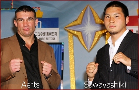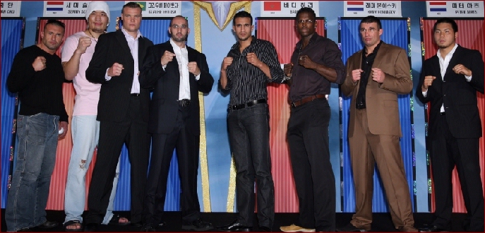 SEOUL, September 30, 2007: The K-1 World Grand Prix '07 Final Eight were determined at the Seoul Olympic Complex this past Saturday night, September 29th. The following day in the Grand Ballroom of the COEX Intercontinental hotel, the first-tier matchups were set for the December 8 Yokohama Arena GP Final. The pairings were decided with a system that combines choice and chance. One after the other, in an order decided by lot, the fighters were free to select any available position on the tournament tree. French K-1 veteran Jerome LeBanner got the first choice, and went to the "A" spot, red corner in the first bout. This is a fighters' favorite, as competing first affords the winner a longer rest period before the semifinals. Twenty-three year-old Japanese wunderkind Junichi Sawayashiki, who had drawn the number two selection, went against the "start early" strategy, opting to avoid LeBanner and instead put himself in the "H" spot, blue corner in the fourth quarterfinal. LeBanner was seen having a bit of a laugh at this. Next up was Korean fighter Hong-Man Choi, and the biggest guy in the tournament, (7'2, 355) who made a bit of a deke on the stage, suggesting he might line up beside Sawayashiki before walking over to the "B" spot and a date with LeBanner. This delighted the Frenchman, who exchanged high-fives with Choi. "I am very happy to fight this giant guy," said LeBanner, "December 8 will be a new Pearl Harbor!" Said Choi: "I am honored to be fighting someone I respect." Two-time WGP Champ Peter Aerts of the Netherlands was up next, taking the spot beside Sawayashiki to set up a fight between the tournament's oldest fighter (Aerts is 36) and the second-youngest (Sawayashiki is 23). |