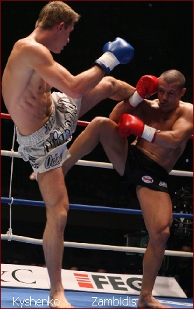 The popularity of the K-1 World Max 70kg/154lbs weight class rivals that of the World GP. Where the heavyweights have the power, the lighter fighters appeal with speed and stamina, consistently producing thrilling contests. This year's K-1 World Max eight finalists represented six different countries. The first quarterfinal was a keenly anticipated matchup between all-round kickboxer and media darling Masato of Japan, who won the Max Belt in 2003; and Thai fighter Buakaw Por Pramuk, whose positively lethal legs and fast fists made him the two-time and Defending Max Champion. Both fighters got the low kicks going early, and the first round had plenty of action -- Buakaw scoring with body blows and a high kick, Masato getting an uppercut in before surprising his opponent with an innocent-looking right straight punch to score a down. The second saw Buakaw good with the hard low kicks, Masato leading with the left straight and deftly picking his spots on the counters, connecting with another uppercut. Masato used the ring to effect, moving to his left, forcing Buakaw to approach with less than perfect positioning. In the third Buakaw needed a down to get back into the fight, but was uncharacteristically tentative with his attacks. Masato meanwhile continued his mastery, focused and fast with the straight punches, closing for another uppercut while absorbing his opponent's low kicks. A fine performance from Masato for the well-earned unanimous decision. The second matchup featured power puncher Mike Zambidis of Greece, a compact bundle of strength and determination; and Ukrainian Artur Kyshenko, a muay thai fighter who also likes the fists. A slow first, Kyshenko with occasional high kicks, Zambidis blocking well and countering with low kicks and body blows -- neither fighter connecting decisively, a slight edge to Kyshenko evidenced on two judges' cards. Better action in the second, Zambidis darting inside with punches but Kyshenko employing his 5cm/2" height advantage to arrest the Greek with long low kicks. In the third, Kyshenko went with the fists, pumping in body blows, while Zambidis launched a couple of flying knees that came up short. Spirited action to end the fight, which one judge gave to Kyshenko and two saw as a draw, triggering a tiebreaker round. A more aggressive Kyshenko in the deciding extra round, in with proficient kicks and combinations; Zambidis meanwhile circling with a hit-and-run strategy, missing again with his flying knees but getting body blows through. A difficult one to call, the decision going to Kyshenko. Dutch boxer Albert Kraus' speed, smarts and punches won him the inaugural World Max Championship in 2002. In tonight's third tournament quarterfinal, the 27 year-old Max veteran met the two-time and Defending Japan Max Champ, kickboxer Yoshihiro Sato. Sato started fast, intent on using his reach and 10cm/4" height `advantage to run Kraus down. But the Dutch fighter was equally aggressive, moving past the straight punches and knees with body blows and uppercuts. Sato sent a number of high kicks up throughout this one, but Kraus' evasions and blocking were sound. In second, a Sato knee looked to have Kraus in trouble, but the Dutch fighter answered with a dandy straight punch and left hook to regain his momentum. The third was thrilling, both fighters repeatedly clashing. Sato again used his long legs to fire the low kicks, and leaped forward with the knees. But a determined Kraus was smart in all aspects of his game -- his movement and positioning were perfect, and he tallied big time late in the round with a punch combination that snapped Sato's head back and, were it not for the ropes, might have put him down. One of the best fights on the night, the unanimous decision going to Kraus. Andy Souwer of Holland set off on the road to glory against muay thai stylist Drago, an Armenian known for both aggression and creativity. |