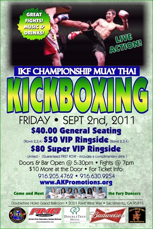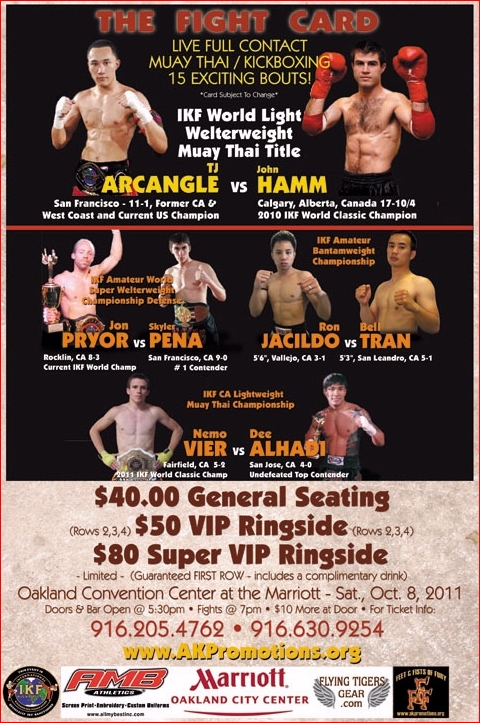 Along with tomorrow nights event, another AK Promotions event has been scheduled for October 8th at the Oakland Convention Center in Oakland, California, USA in preparation for the First Annual IKF West Coast Classic Tournament that will be held in Sacramento at the Sacramento Radisson Hotel in late November. The First Annual IKF West Coast Classic will have fighters from around the world participating in this "Golden Glove like" tournament in assorted rules styles adding to a full weekend of action-packed fights, vendors, movie stars and more... Simply put,