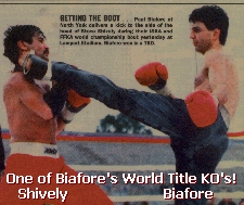 From A Fan: "In his time and reign as champion there were few that came close to his level of kickboxing ability and ring generalship. Inside the ring he had incredible speed and power, and his timing and reaction skills were second to none. Outside the ring Paul Biafore always carried himself with class and was humble and very well liked everywhere he went. Paul's reign? as 4 time World Welterweight Kickboxing Champion never recieved the recognition he deserved." shin2dachin | ||