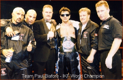 The last time any of us saw Paul Biafore of Missaga, Ontario, Canada in the ring he was blasting Bernard "Swiftkick" Robinson of Pittsburgh, PA, USA by TKO at the end of the 4th round in Lowell, Massachusetts, USA on May 14th, 1999. Biafore was ahead on all the cards at the time, 40-36, 40-35 & 40-35. The bout was in Lowell Massachusetts, USA. Paul was trained by Nick Ventura and the IKF title he won was the IKF Pro Full Contact Rules World Welterweight Title. With the fresh win improving his fight record to 31-4-1 with 16 wins by KO, it would appear he had plenty of fight left in him. However, the truth was, although he had plenty to dish out to others in the ring, it seemed no one wanted a part of Biafore ever again. Since his IKF World Title victory in May of 1999 he never received any worthy offers to fight again. So instead of sitting around to wait for the phone to ring he started doing other things. Two of those things helped in his decision to pack up his bags and move to sunny Southern California. his quest... To pursue a career in Music as well as start teaching his skills to others. Biafore has nothing to prove to anyone ever again in the ring as a fighter. Holder of multiple World Titles, he's proven himself plenty to everyone. Over the years he was competing in Kickboxing we have watched his career closely. It's not hard to find many who would agree that he is clearly one of the best fighter of his time in his weightclass. He comes to the table with dedication, diligent, confidence, depth of knowledge and experience. To find another competitor like Biafore may take a lifetime. His plans now are to be the best instructor, coach , and mentor any new competitor could wish for. We are confident that he will push them to the greatest heights and take them to places they not thought possible on there own. The benefits of his years of experience and competition will prove invaluable. In our opinion there are very few others that can do what Paul Biafore has done and can do for the sport and the students of kickboxing. If you are interested in booking Mr. Biafore for seminars please contact the IKF for more info.