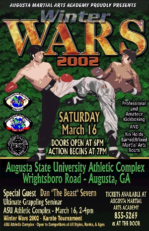 Augusta Martial Arts Academy's Mike and Elizabeth Carlson, who were recently voted "2001 IKF Promoters of the Year", are gearing up for their biggest event yet. Winter Wars 2002 will be held on March 16, 2002, at the Augusta State University Athletic Complex in Augusta, Georgia. The nighttime event will feature IKF and Professional Karate Commission (PKC) sanctioned professional and amateur full contact/American rules (kicks only above the waist) kickboxing bouts and International Sport Combat Federation (ISCF) sanctioned amateur and professional mixed martial arts matches. The evening fights will come after a daytime karate tournament, also sanctioned by the PKC. Continuous point sparring, forms, weapons and grappling divisions for all ages and belt levels will be available. But it will be that night when the "Border Wars" and other battles at WW 2002 will truly begin.